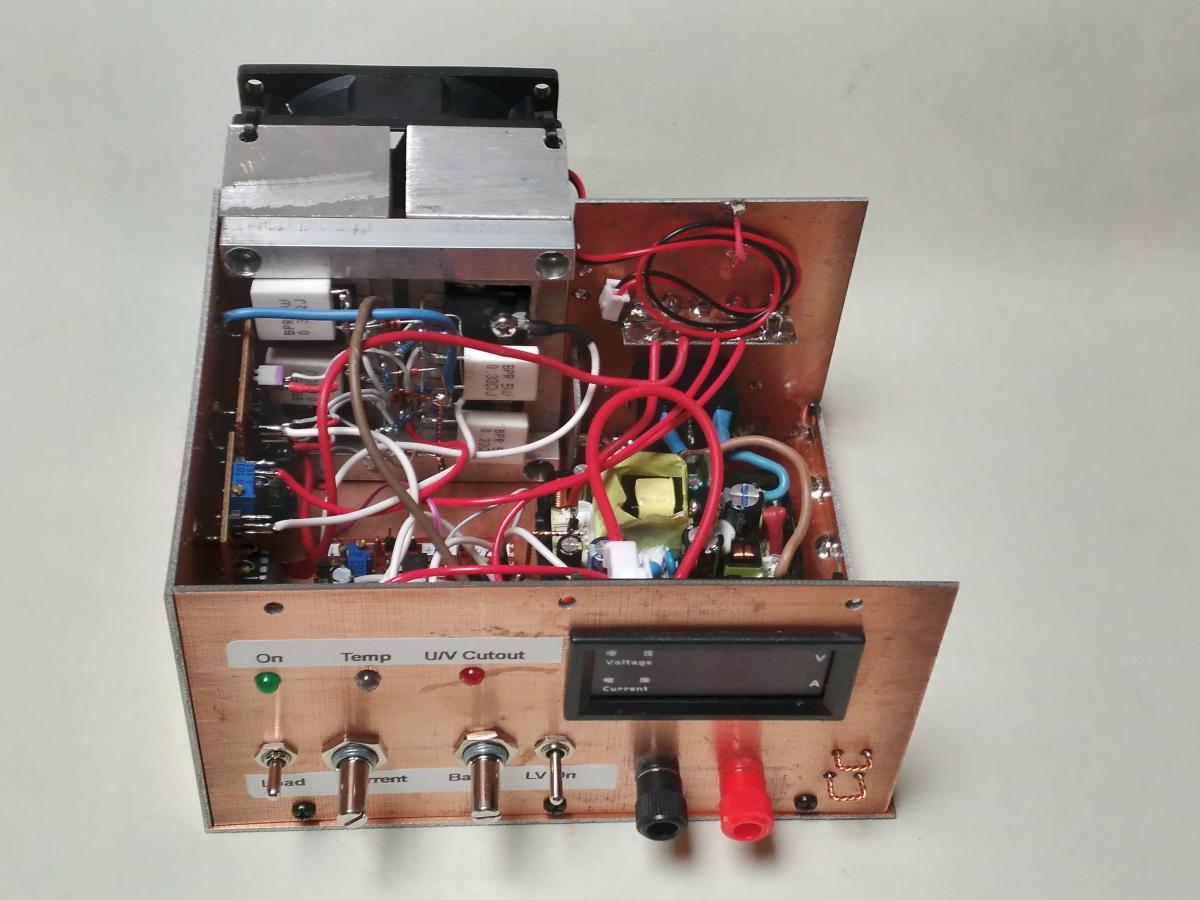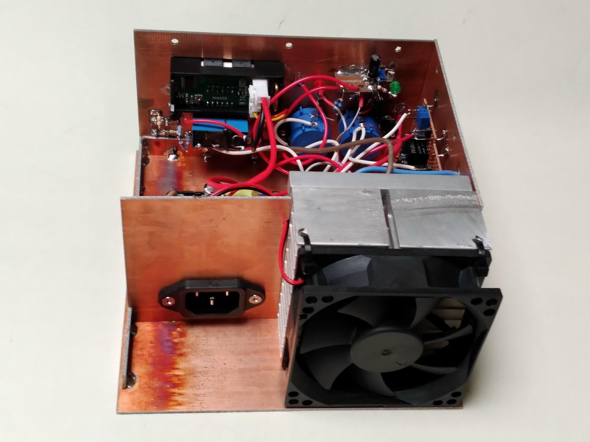 I used double-sided blank PCB material for construction, which meant that joins could be soldered. The power supply is a switchmode module, 'liberated' from most of its enclosure and hard wired to the IEC socket. Everything else is either on Veroboard or 'sky-hooked' using thick copper wire for all current-carrying connections. The reverse-polarity relay is visible just below the meter module. There is a cover for it, so it's completely enclosed when that's installed. Without the cover it's a bit 'wobbly', but it's rock-solid with the cover installed.